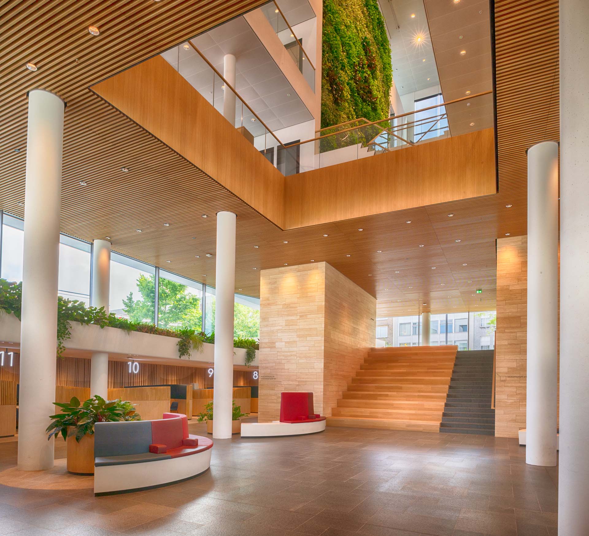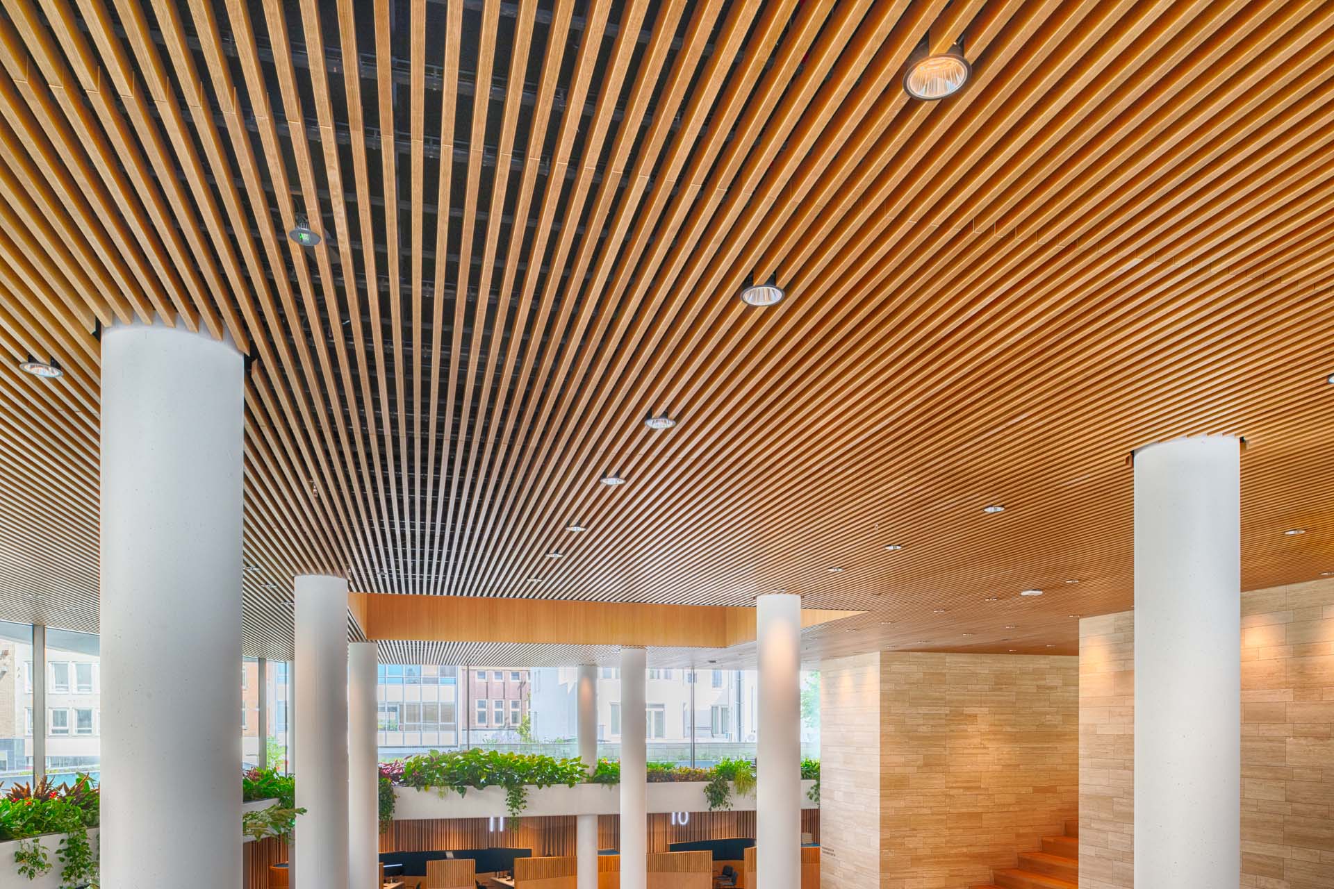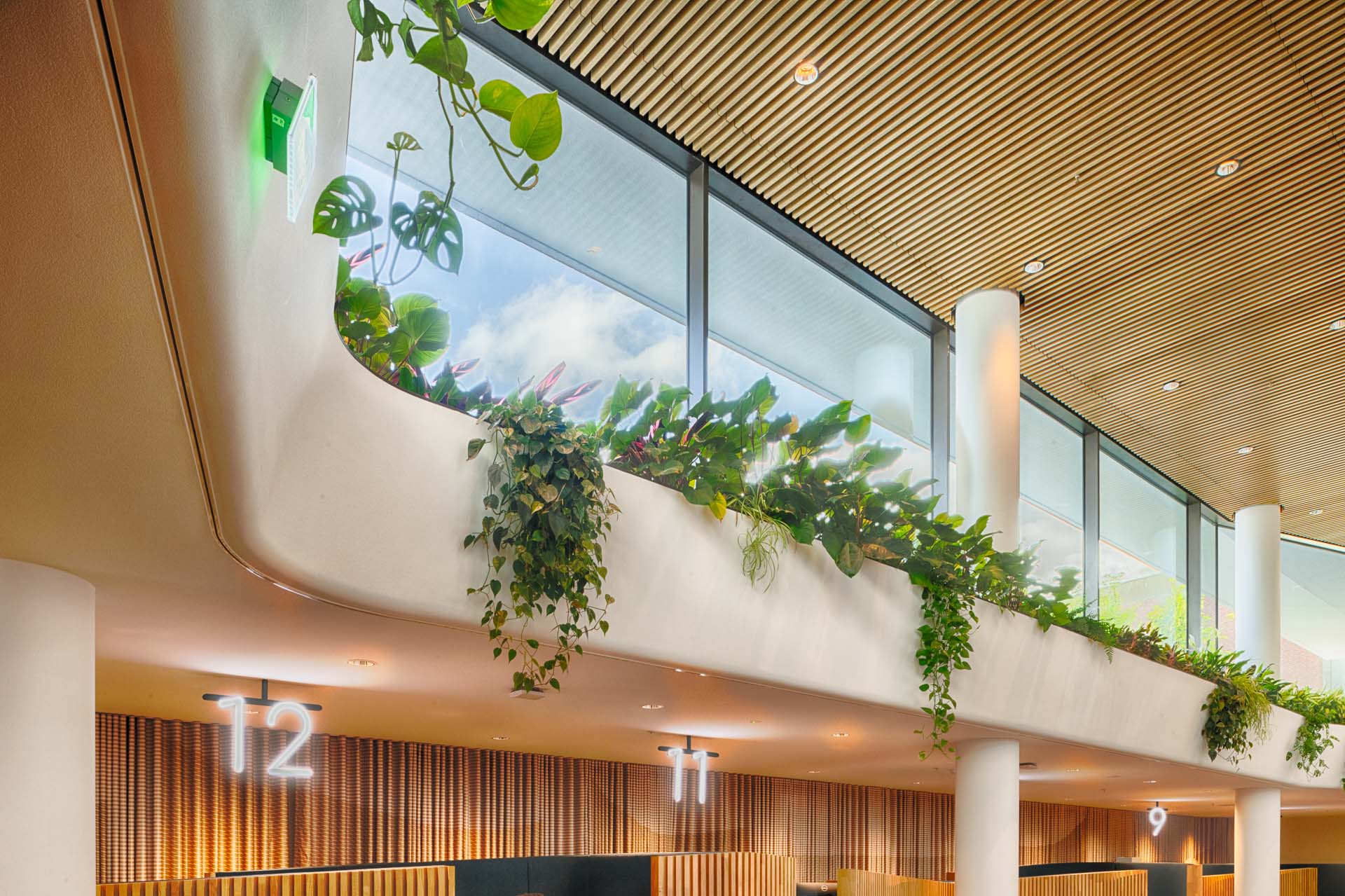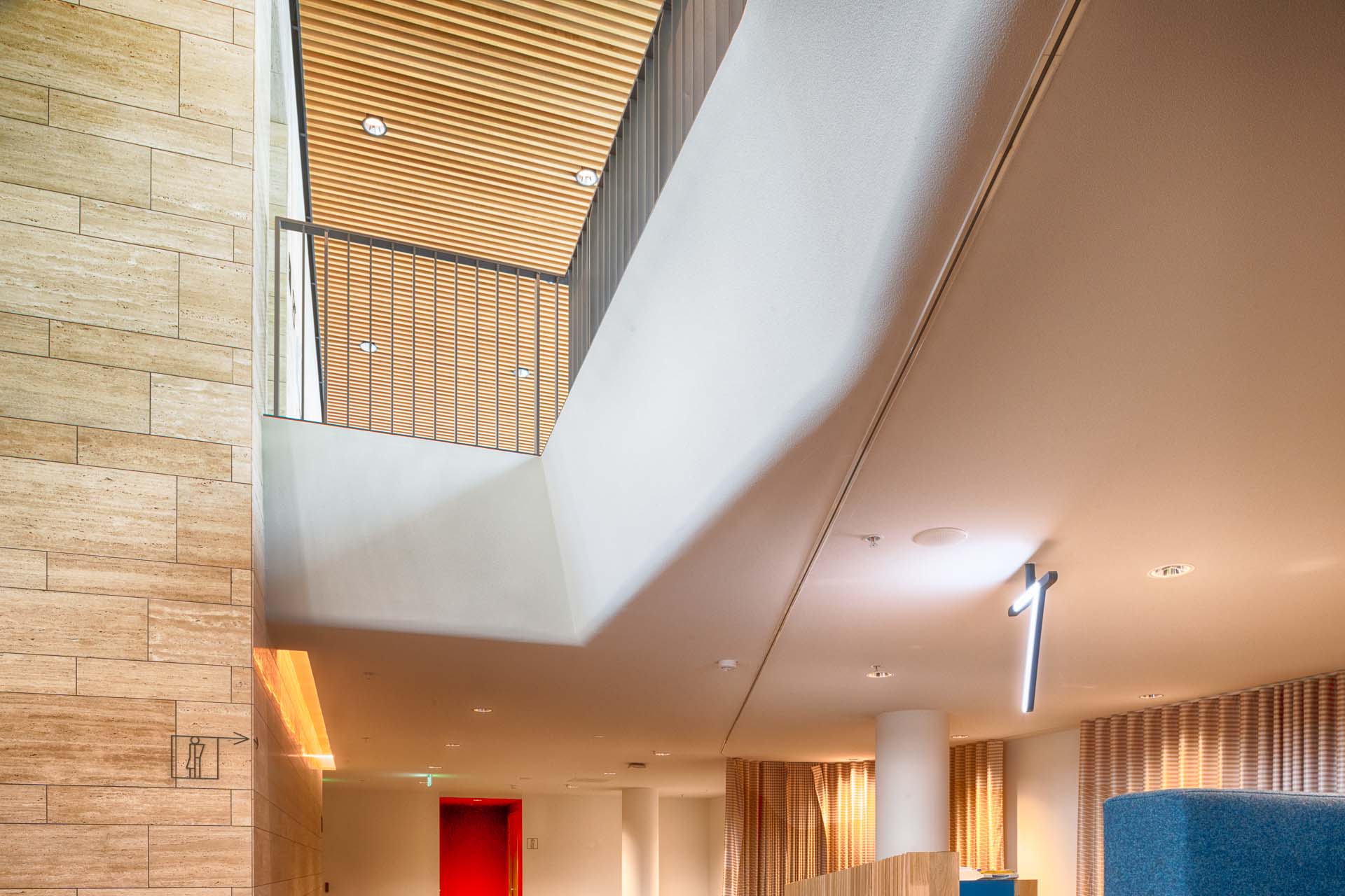 Een project waar we al sinds 2018 bij betrokken zijn, omdat we pro-actief hebben meegedacht over diverse toepassingen en alternatieven voor wanden, plafonds en betimmeringen. In de hal is er uiteindelijk gekozen voor houten Grill plafonds en op maat gemaakte koven welke prefab uit gietgips zijn gemaakt. In het lagere deel zijn naadloze akoestische plafonds voorzien.
