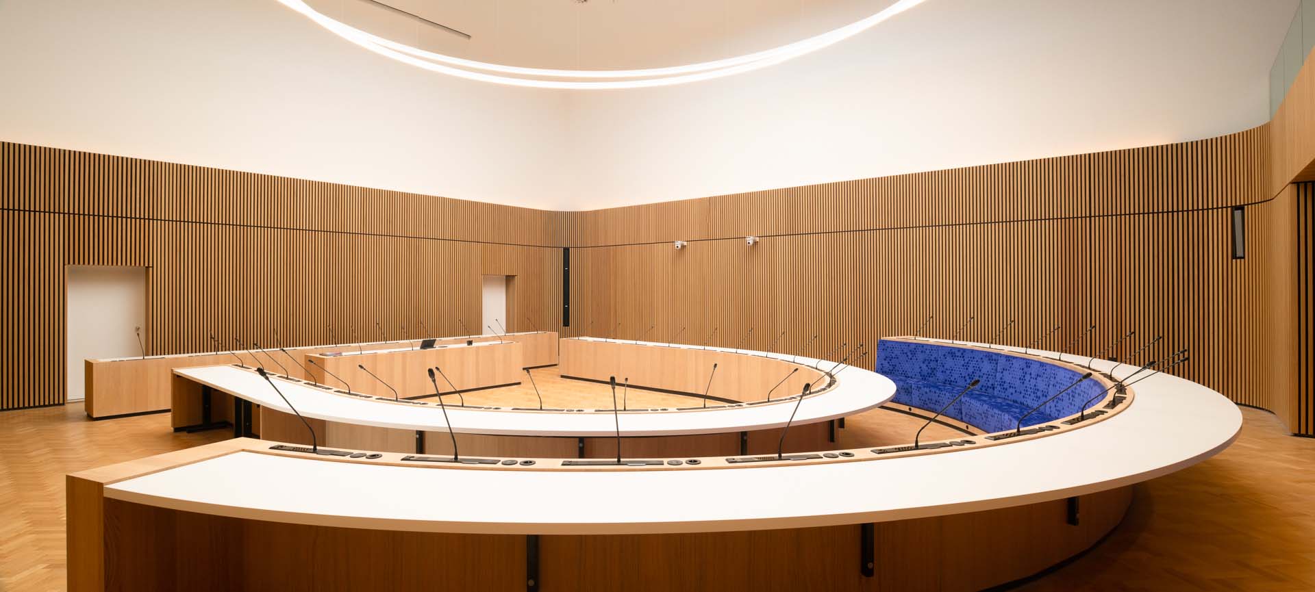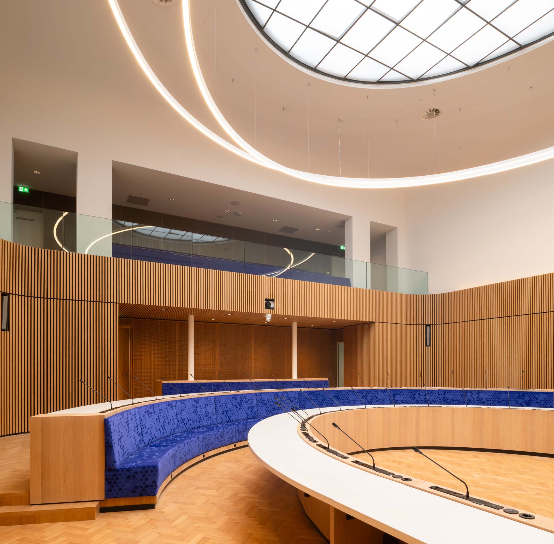 De wanden rondom de raadzaal zijn onder andere opgebouwd uit verticale houten latten met akoestische functie. Ook hier zijn weer prefab gemaakte ronde koven uit gietgips toegepast.
