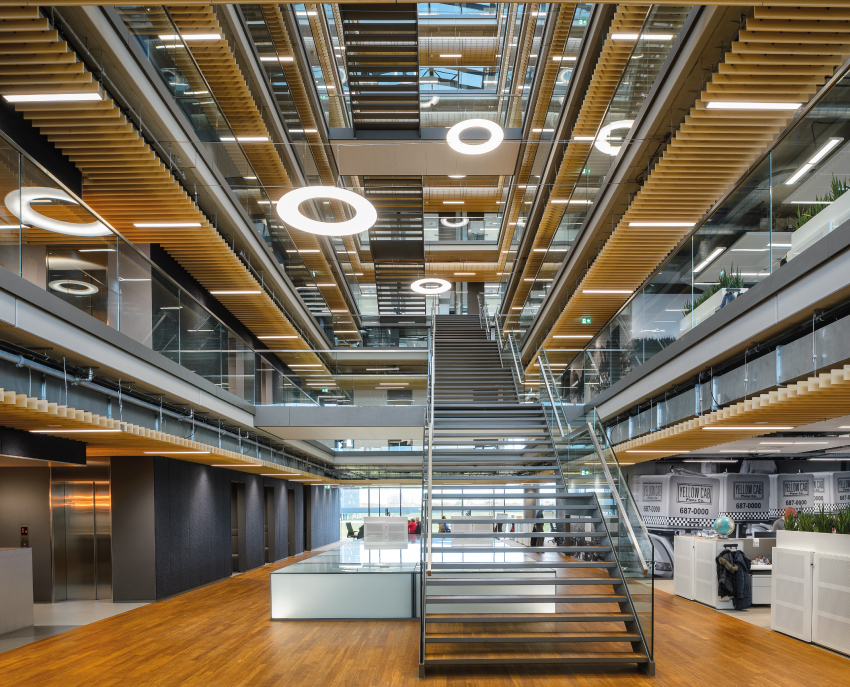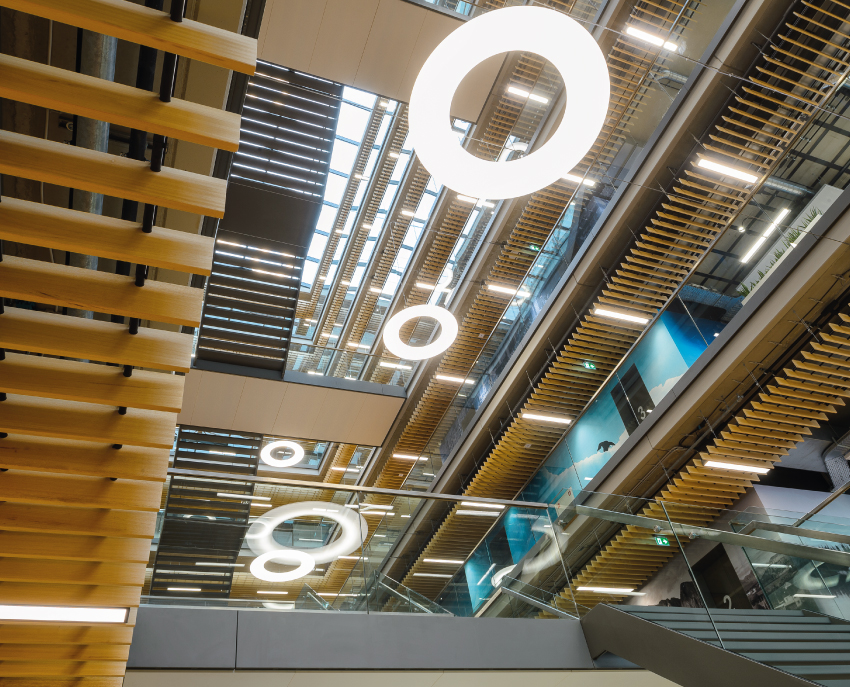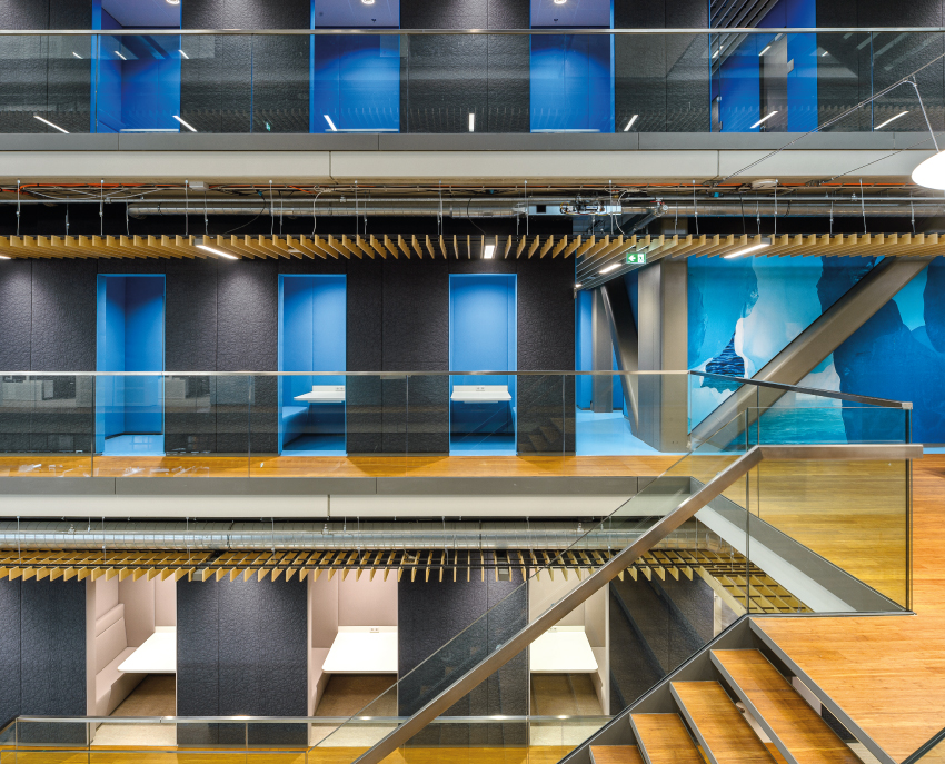 Gepla heeft in dit prestigueuze project alle open houten plafonds, de gestoffeerde wandbekleding en de engineering en uitvoering van de metalen eilanden verzorgd.